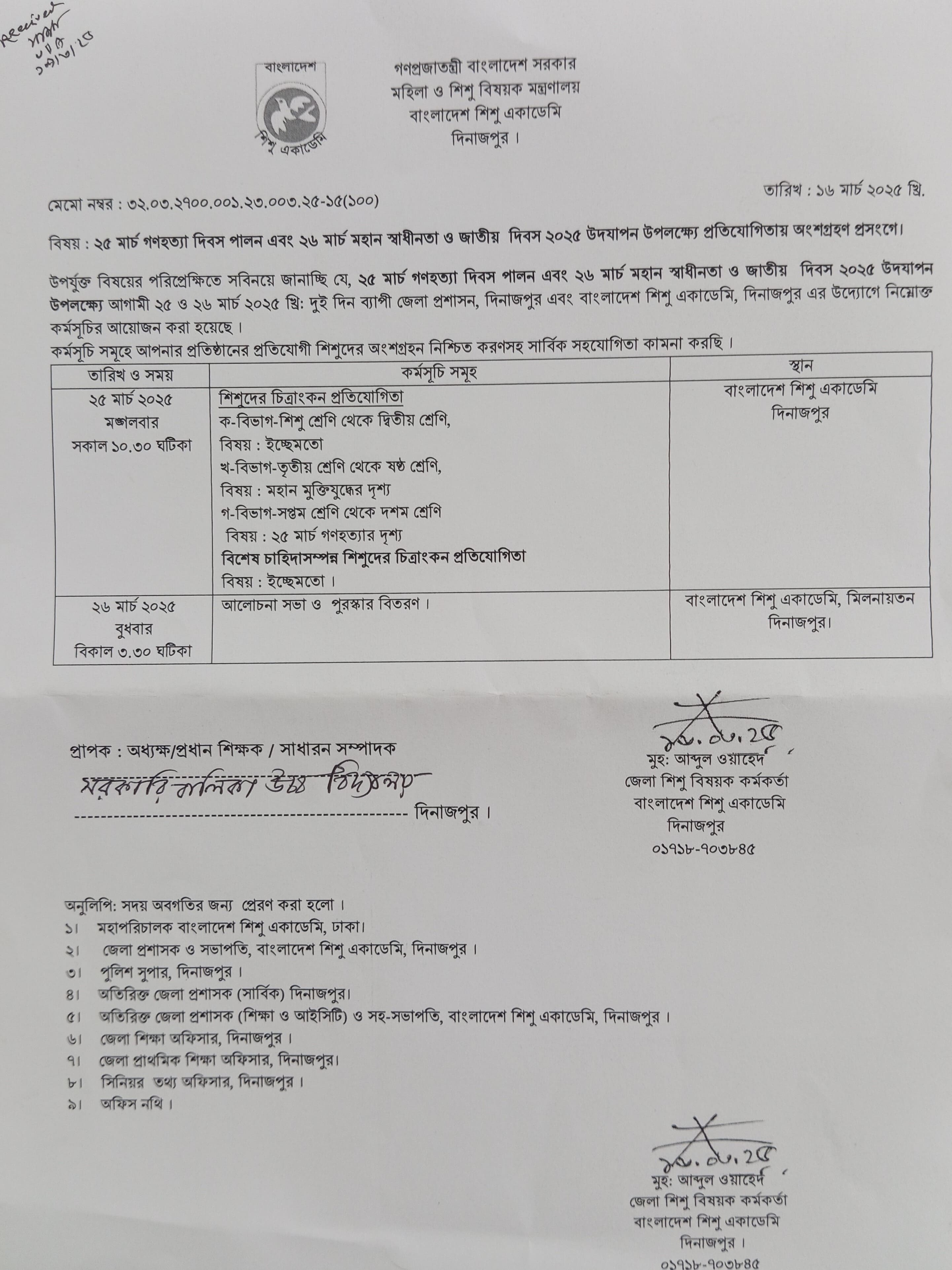 ২৫ শে মার্চ গণহত্যা দিবস এবং ২৬ শে মার্চ মহান স্বাধীনতা ও জাতীয় দিবস ২০২৫ উদযাপন উপলক্ষে প্রতিযোগিতায় অংশগ্রহণ প্রসঙ্গে।