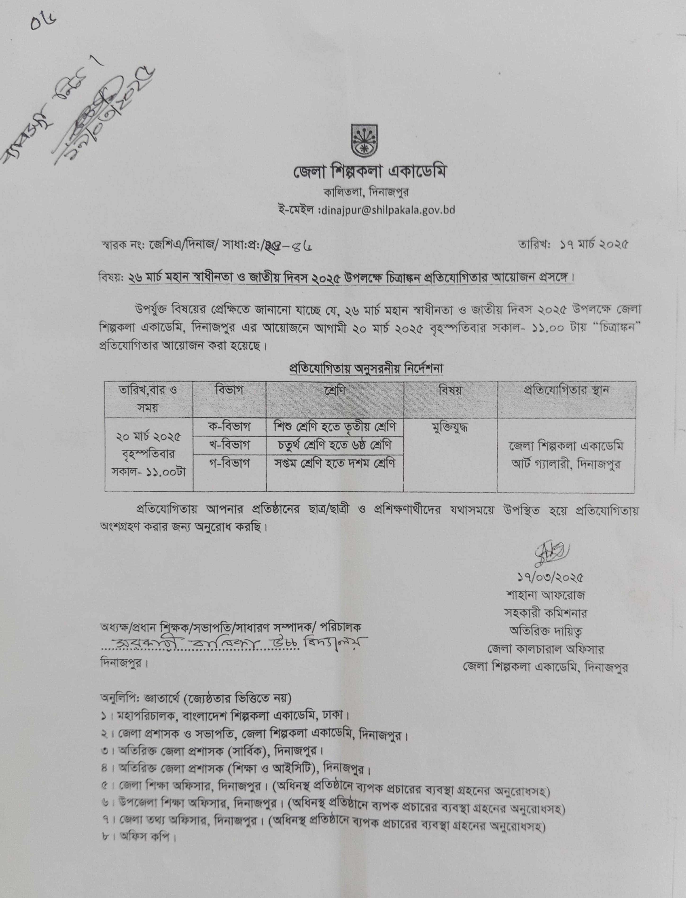 ২৬ শে মার্চ মহান স্বাধীনতা ও জাতীয় দিবস ২০২৫ উপলক্ষে চিত্রাঙ্কন প্রতিযোগিতার আয়োজন প্রসঙ্গে।