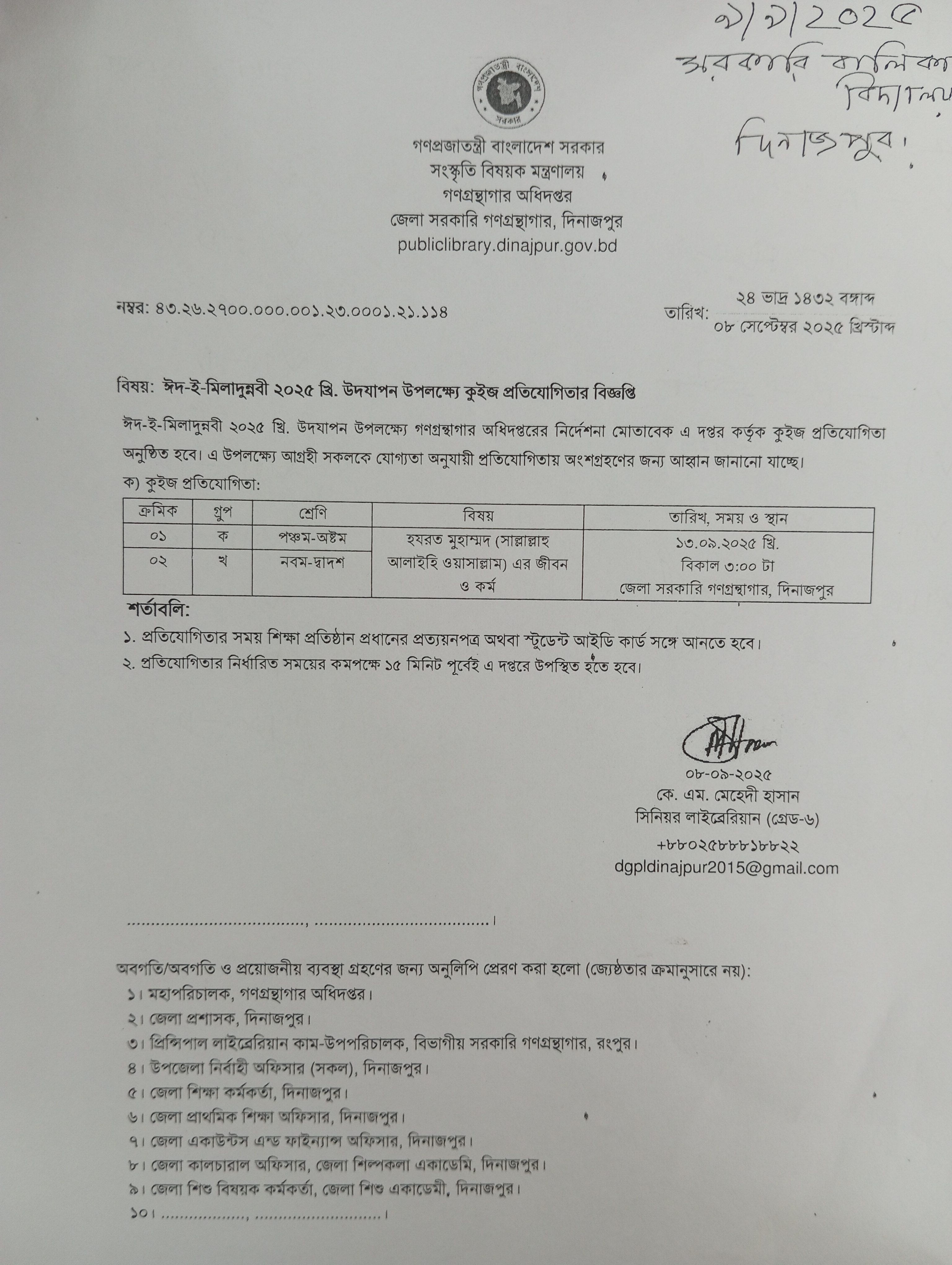 ইদ-ই-মিলাদুন্নবী ২০২৫ খ্রি: উদযাপন উপলক্ষে কুইজ প্রতিযোগিতার বিজ্ঞপ্তি।