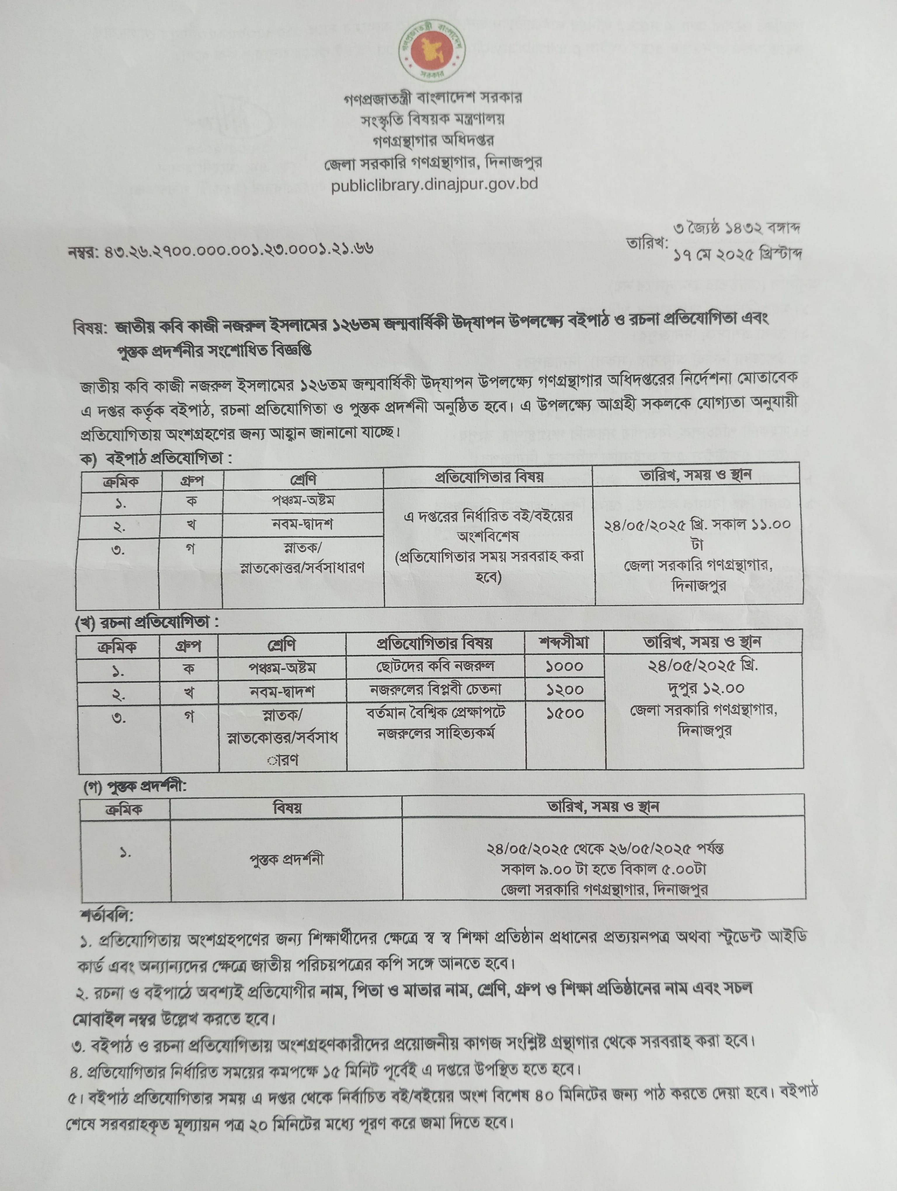 জাতীয় কবি কাজী নজরুল ইসলামরে ১২৬তম জন্মর্বাষকিী উদযাপন উপলক্ষে বইপাঠ ও রচনা প্রতযিোগতিা এবং পুস্তক প্রর্দশনীর সংশোধতি বিজ্ঞপ্তি