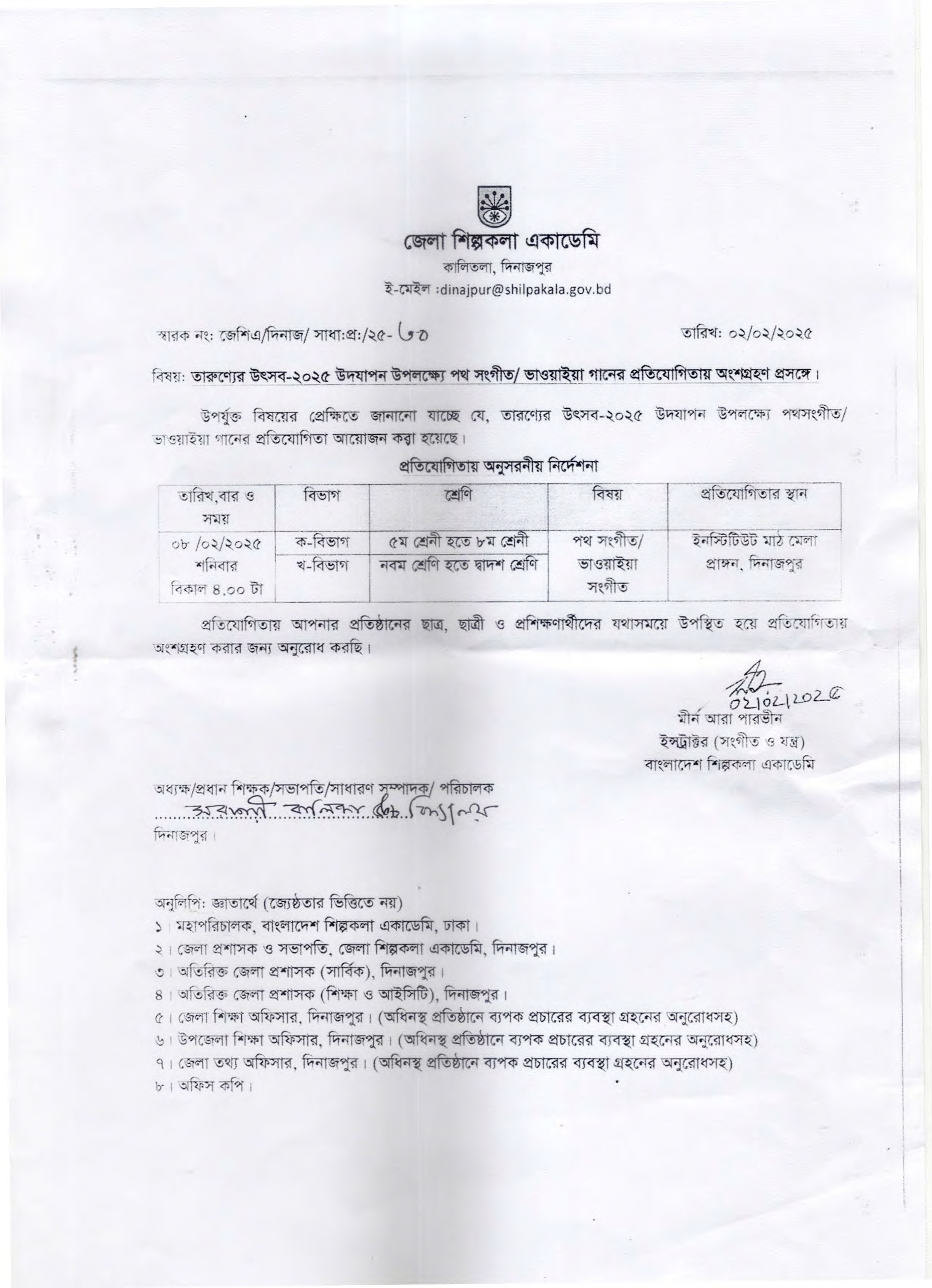 তারুণ্যের উৎসব-২০২৫ উদযাপন উপলক্ষ্যে পথ সংগীত/ ভাওয়াইয়া গানের প্রতিযোগিতায় অংশগ্রহণ প্রসঙ্গে।